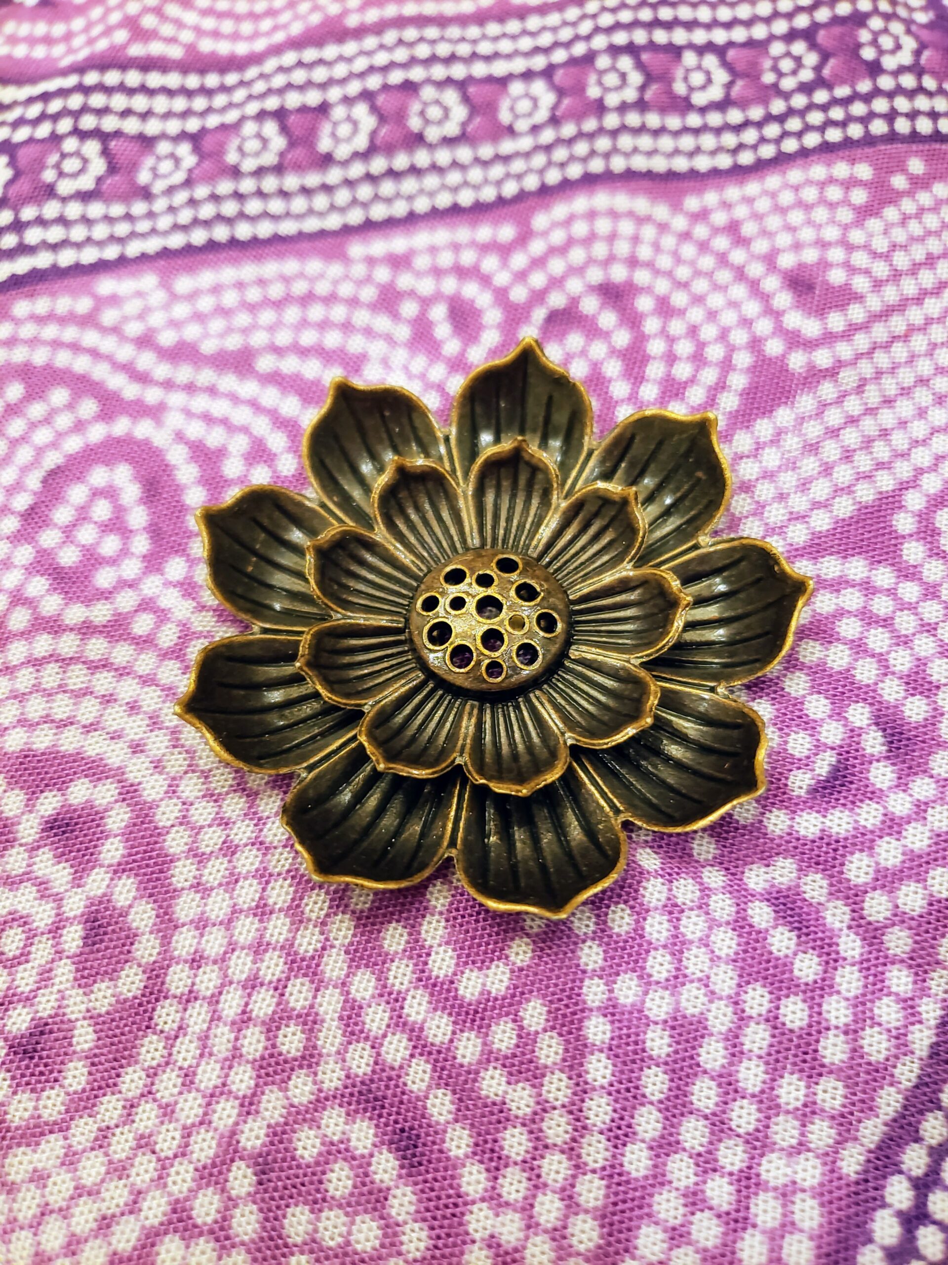 Brass Incense Holder; Elegant Lotus Design, with 6 holes for a variety of incense sizes; approx. 2.25 inches in diameter