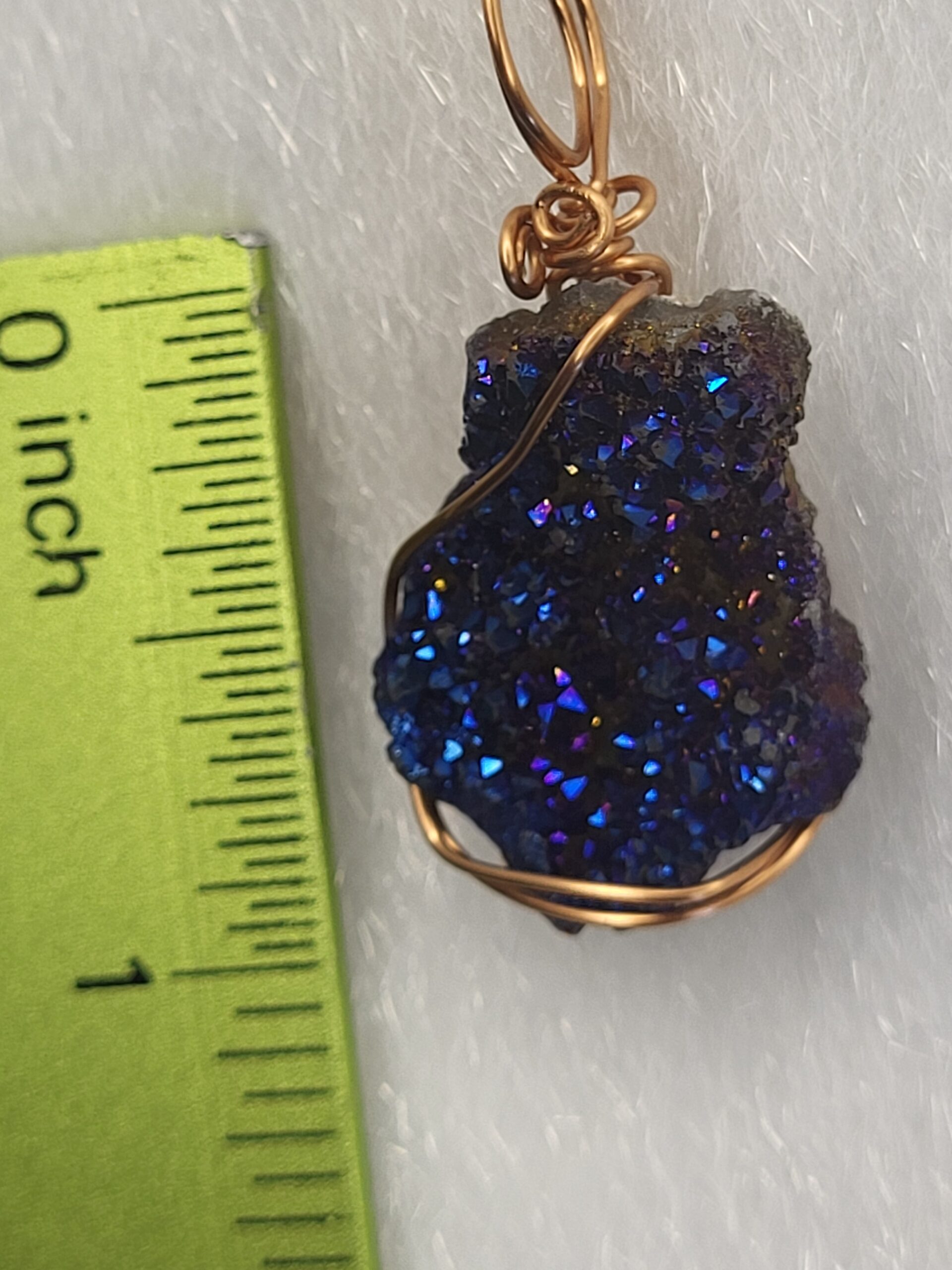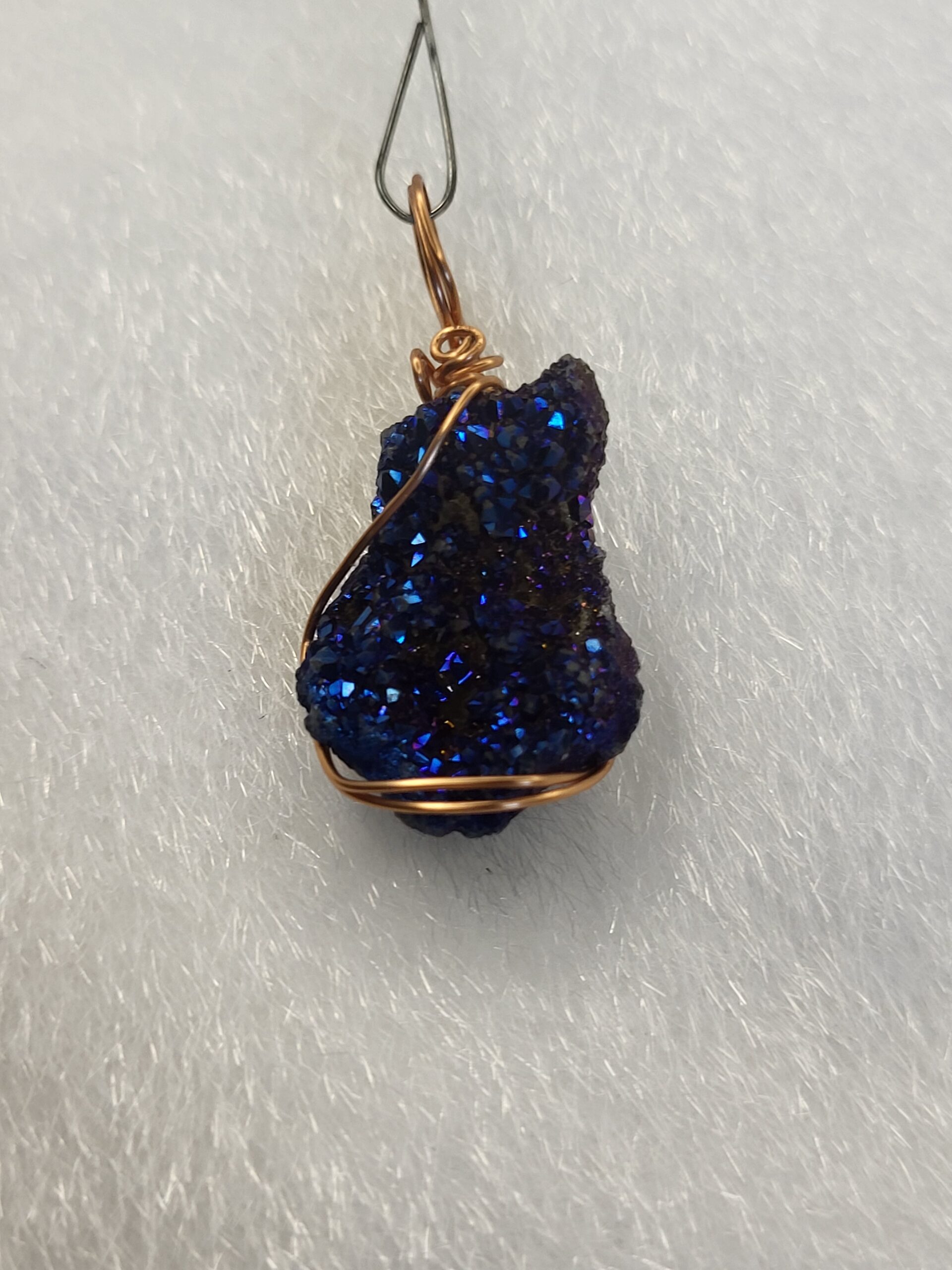 Copper wrapped Cobalt Blue Aura Quartz / Titanium Aura Quartz; Ornament or Pendent. 1.5inch in length, with Copper Spiral Hook; Ornament or Pendent.