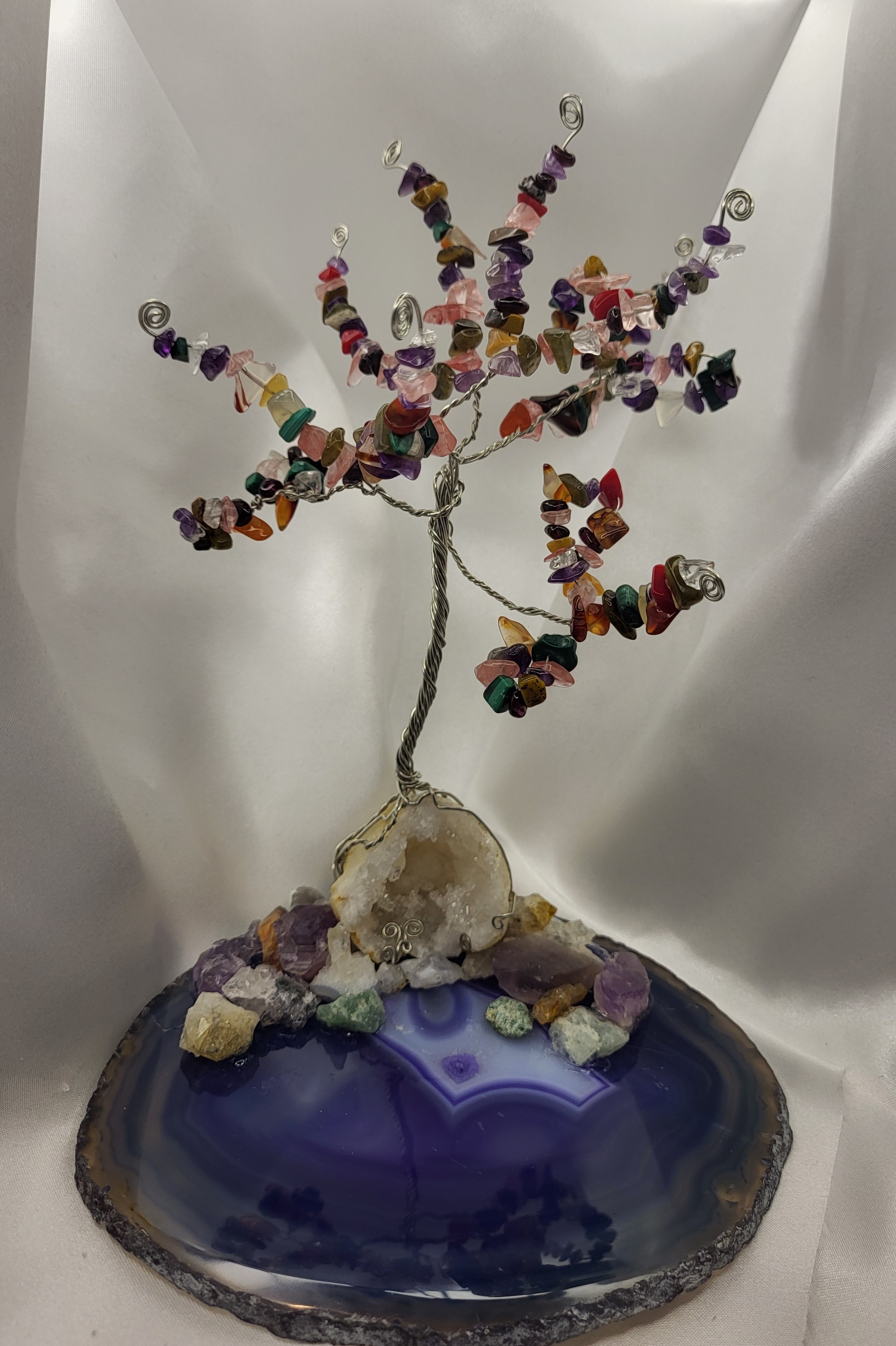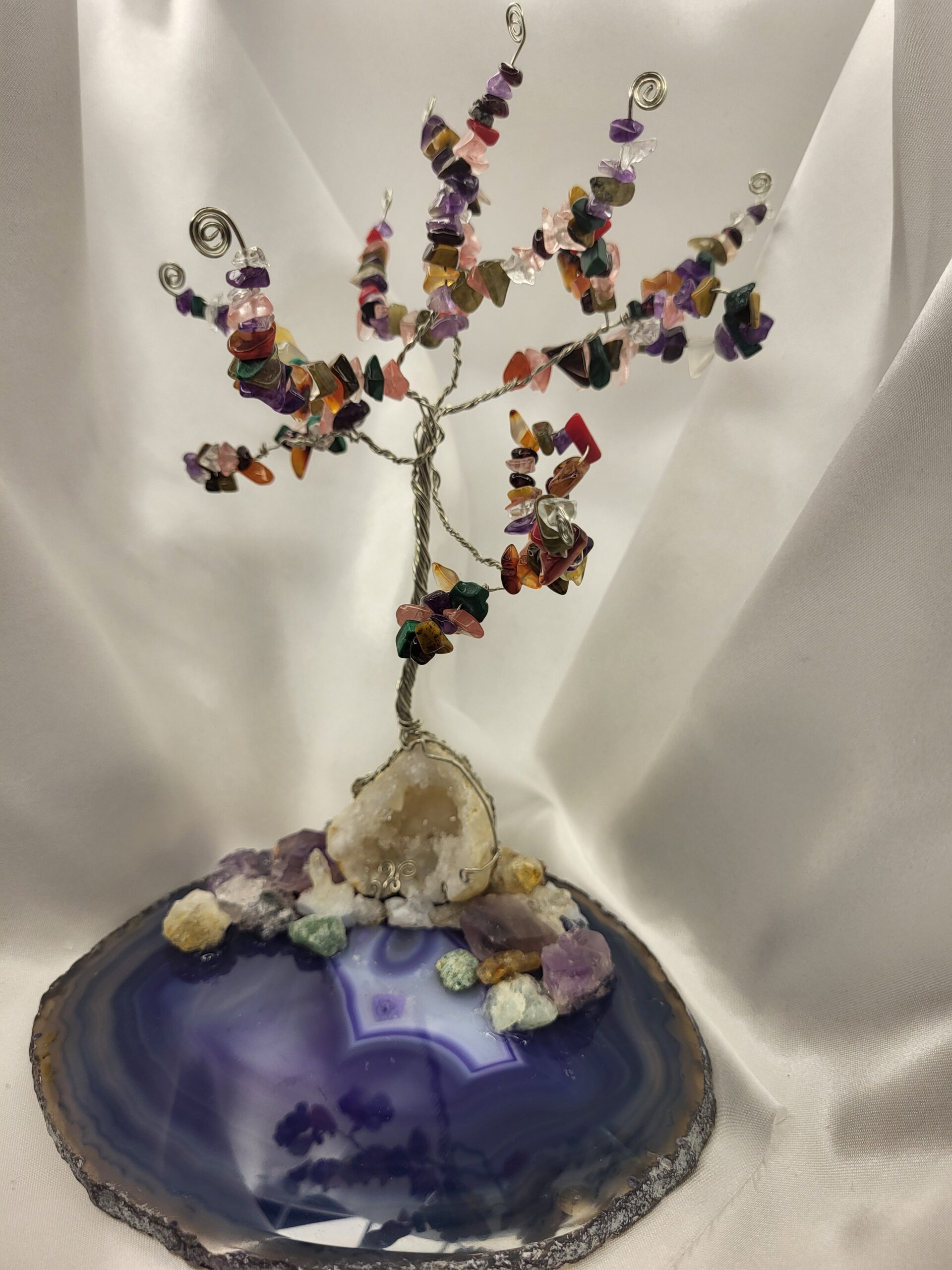 Crystal Gemstone Wire Tree on open Geode. Set on Indigo Agate base. Semi precious gemstones. Measures 6 inches by 4 inches.