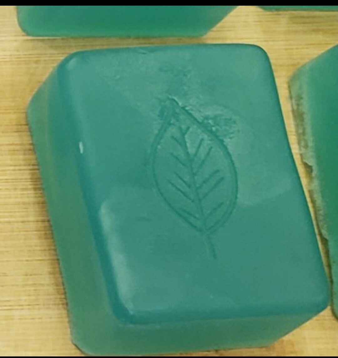 Homemade Soap, opaque, emerald green bar with simple leaf.