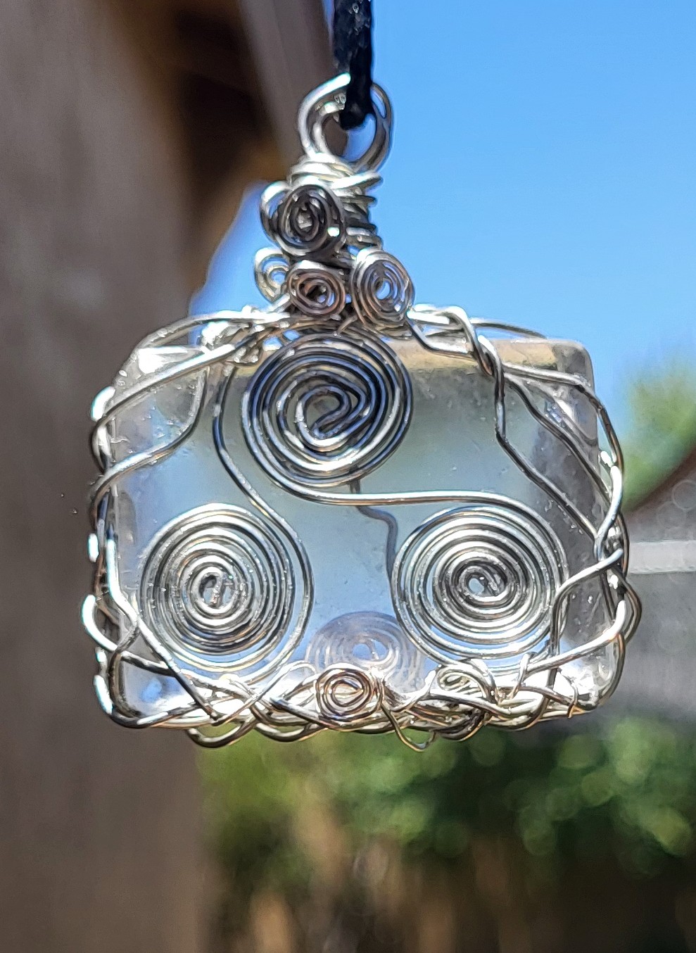 Silver Copper wrapped Opaque Quartz, with Celtic Triskele, Pendent, 24 inch black cord necklace.