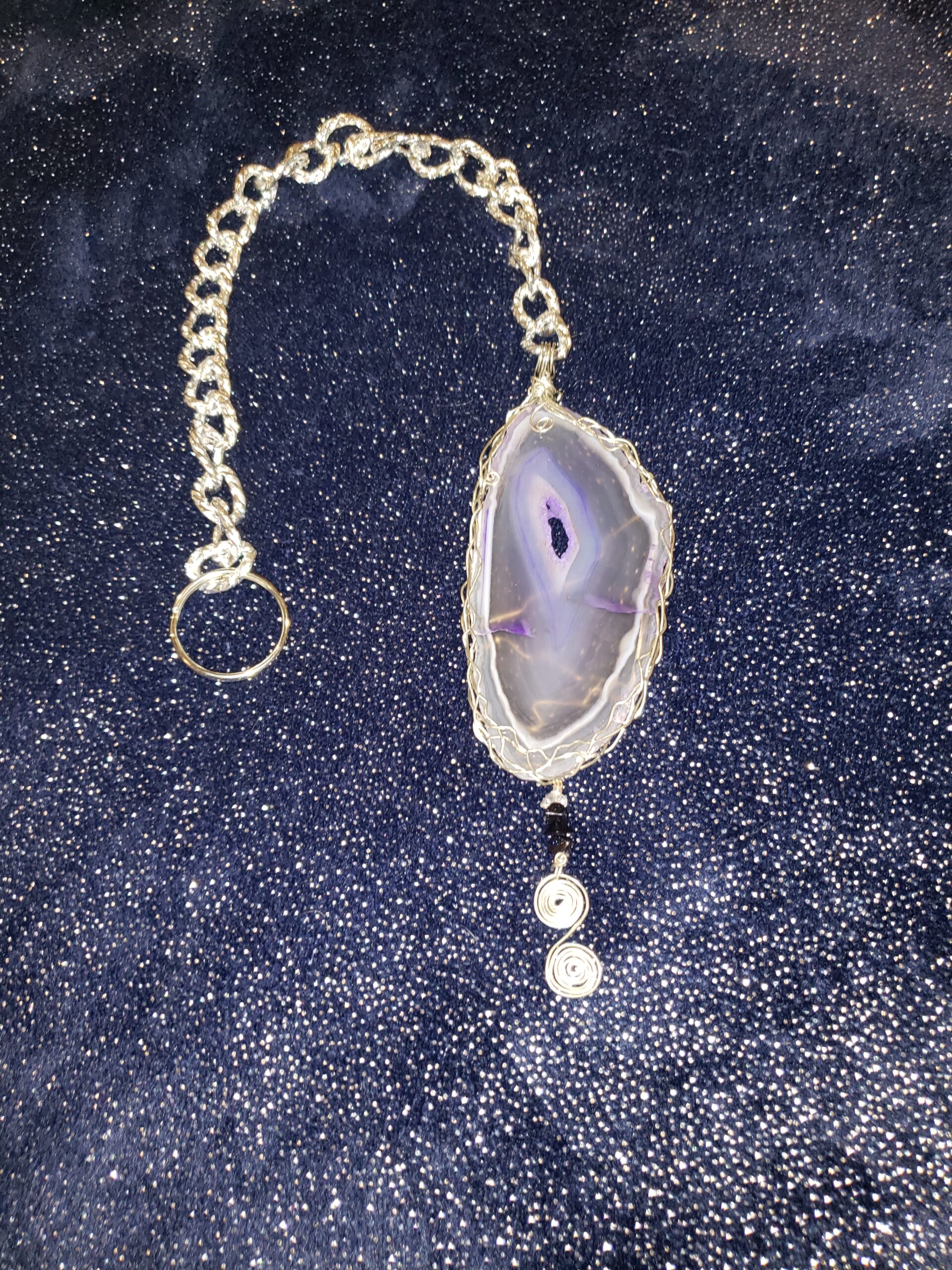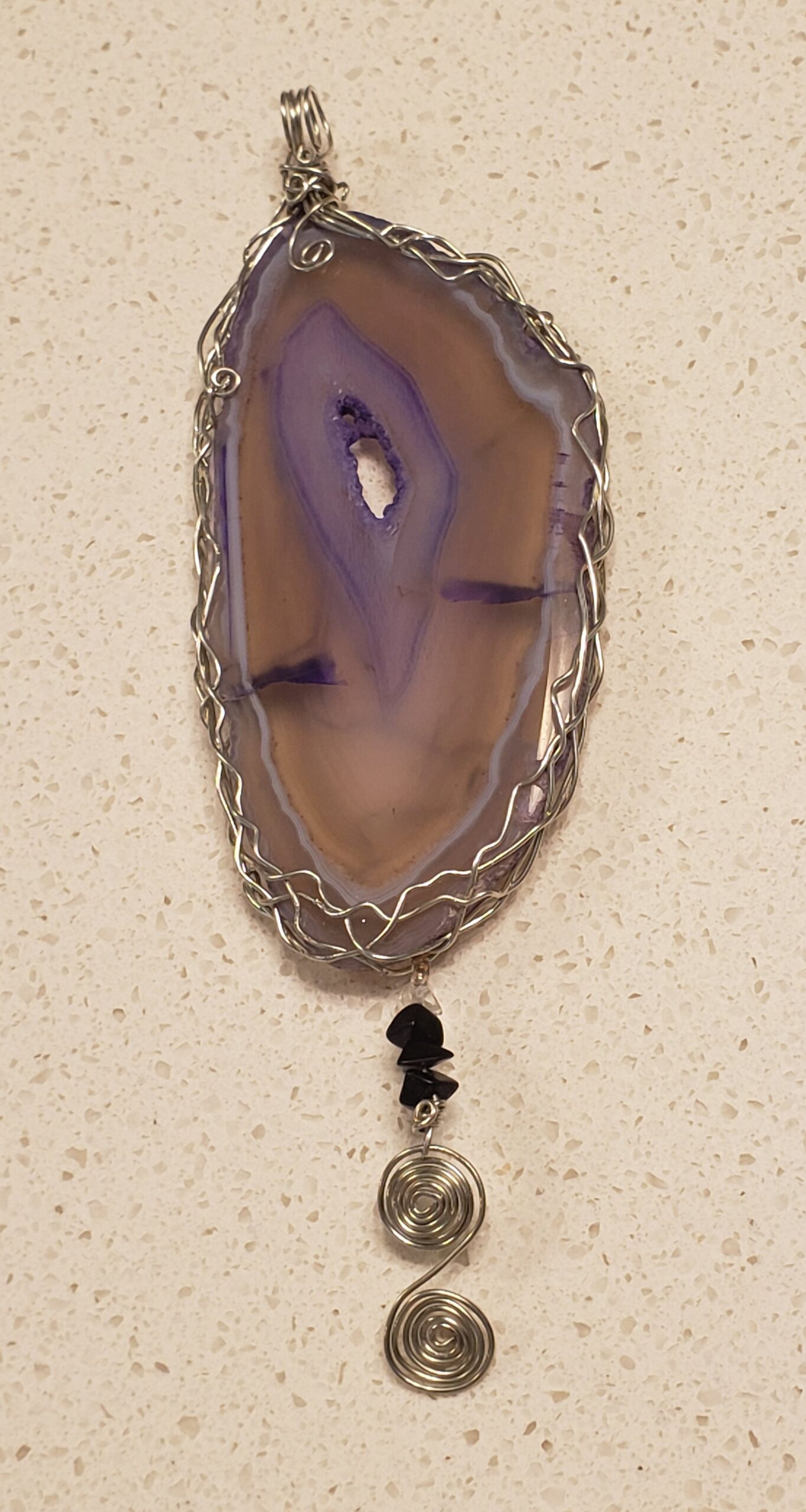 Suncatcher of Agate, silver metal wrapped with double spiral. Matching chain and hoop to be included.