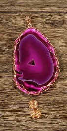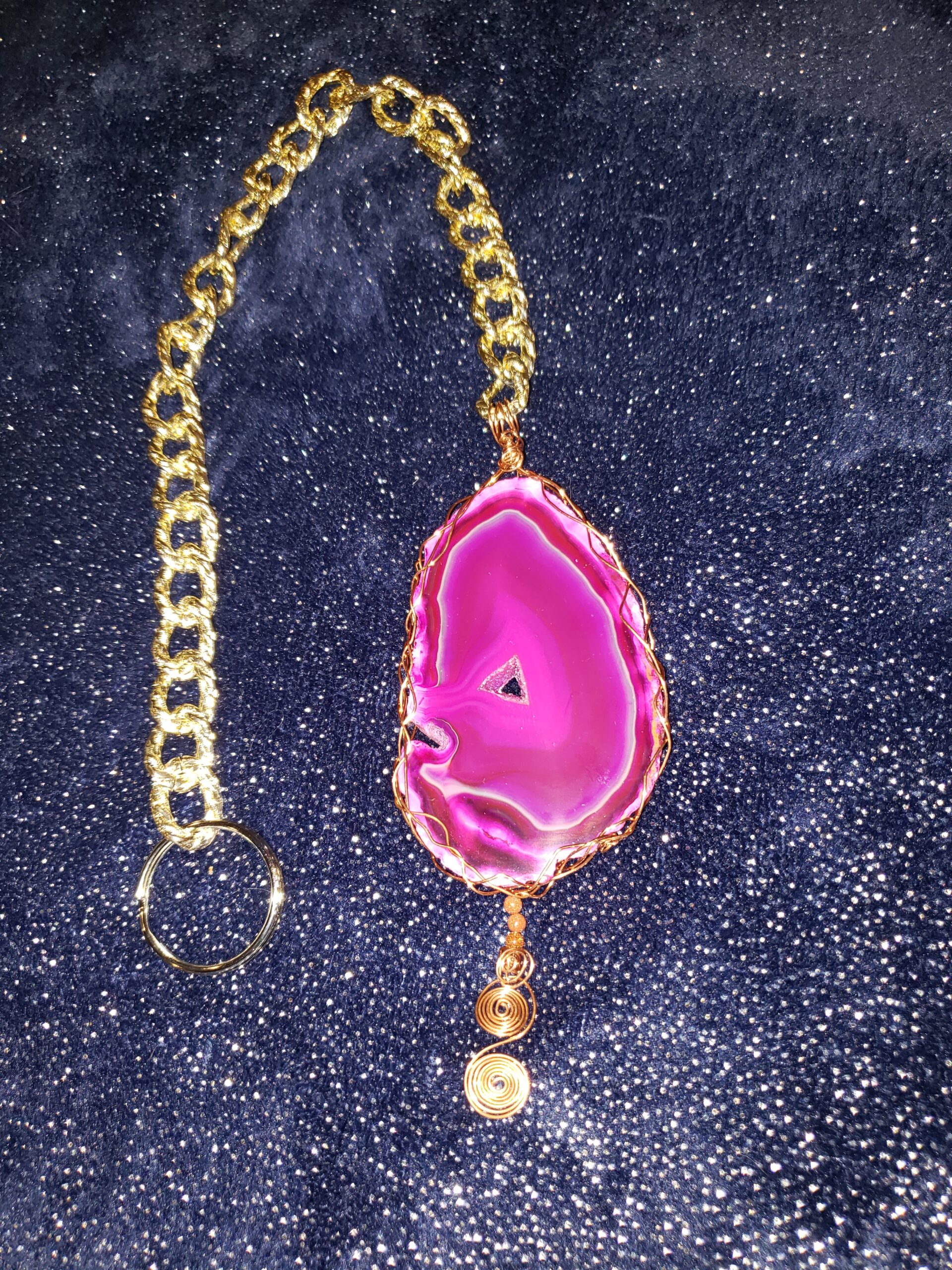 Suncatcher of Agate, copper wrapped with double spiral. Comes with matching chain and hoop.