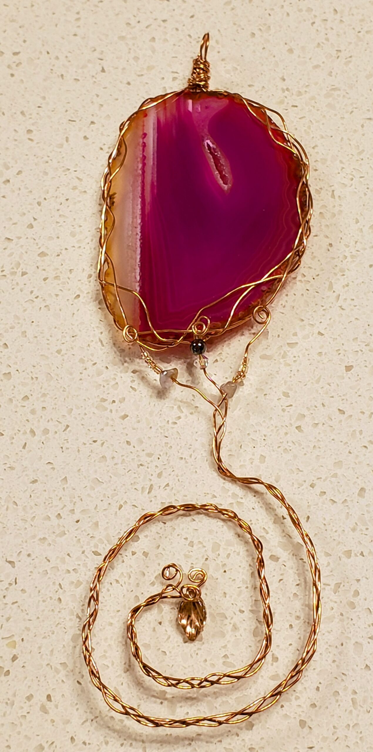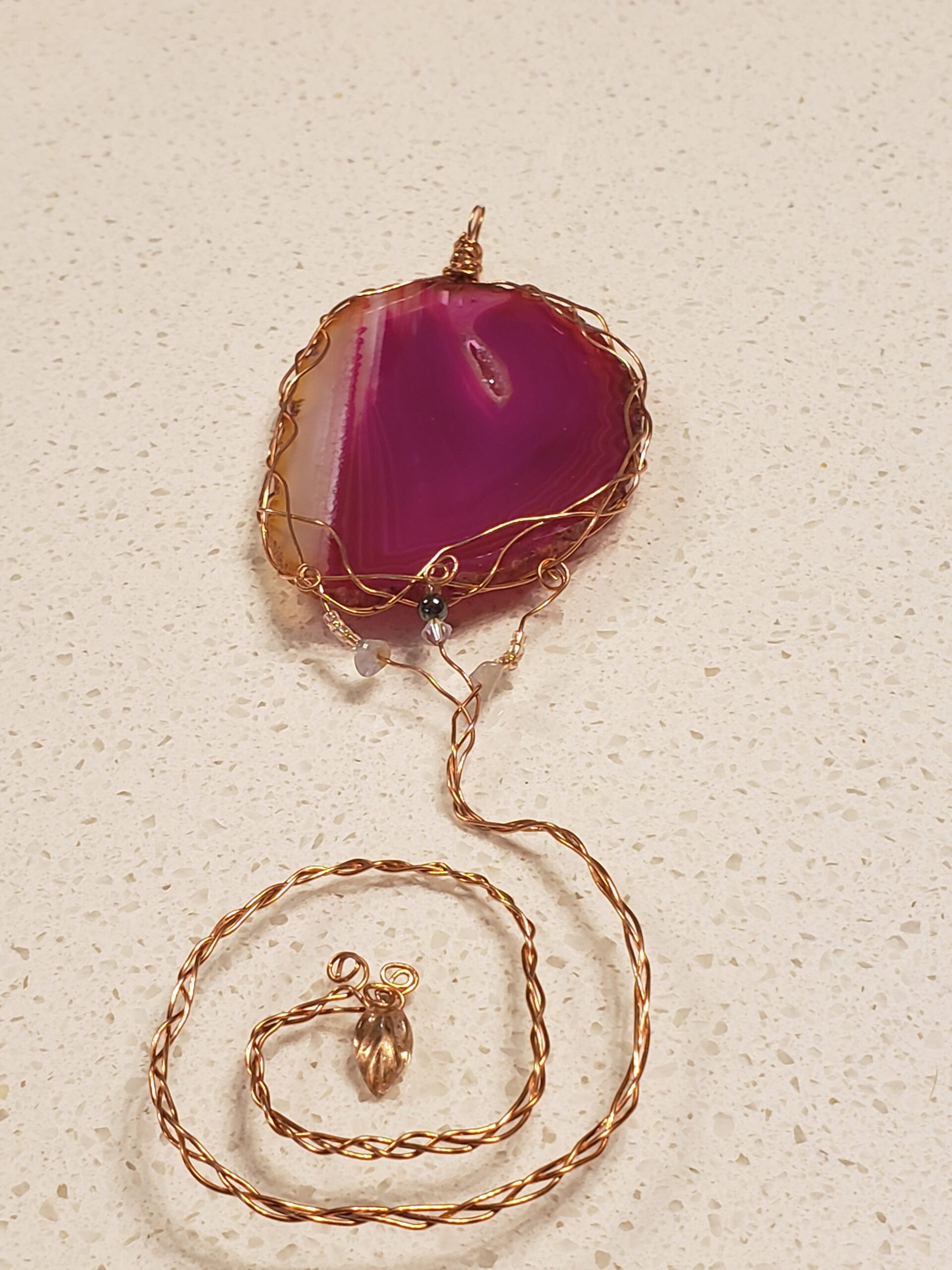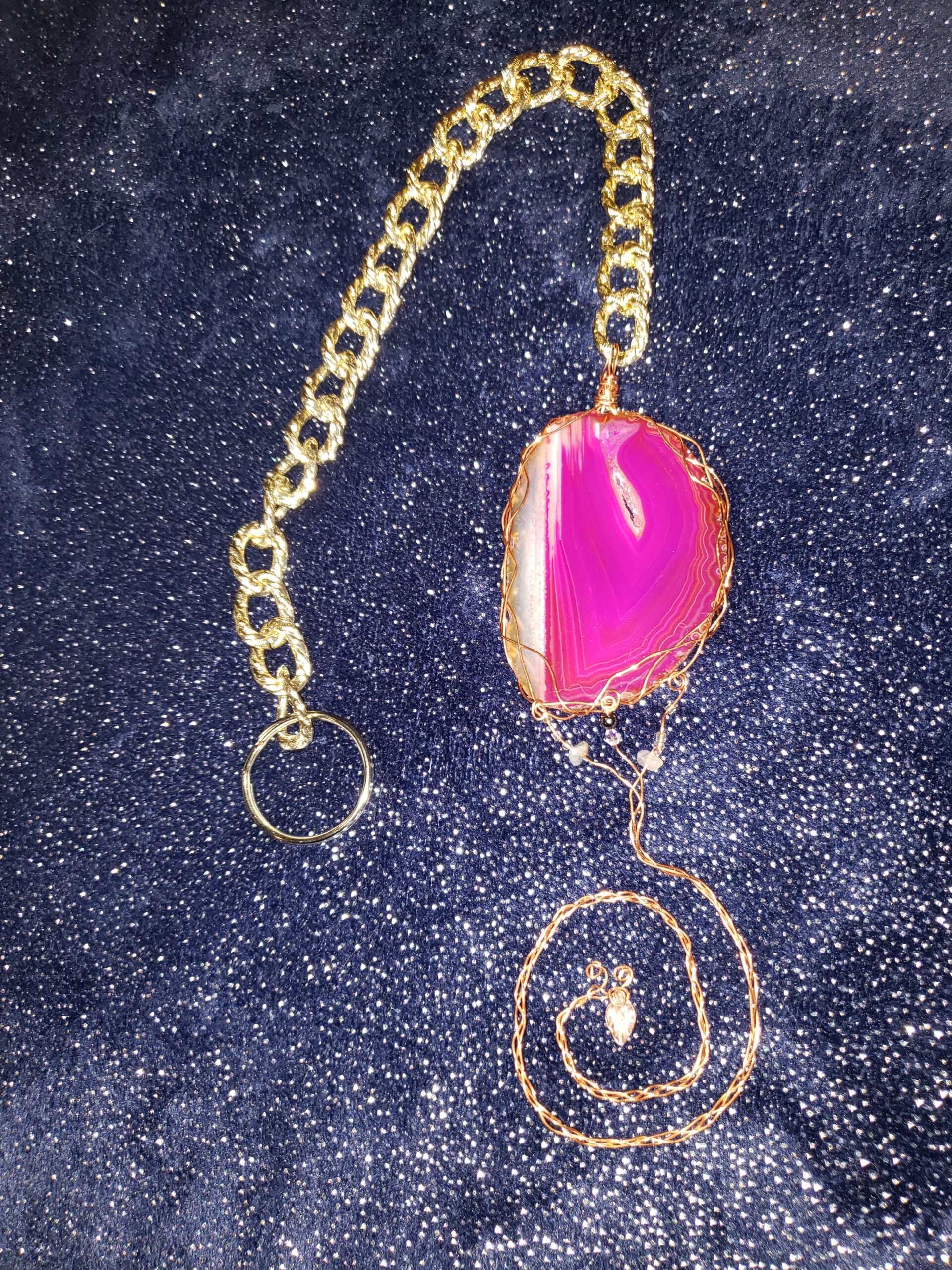 Suncatcher of Pink Agate, copper metallic wrapped with added gemstones and spiral. Matching chain and hoop to be included.