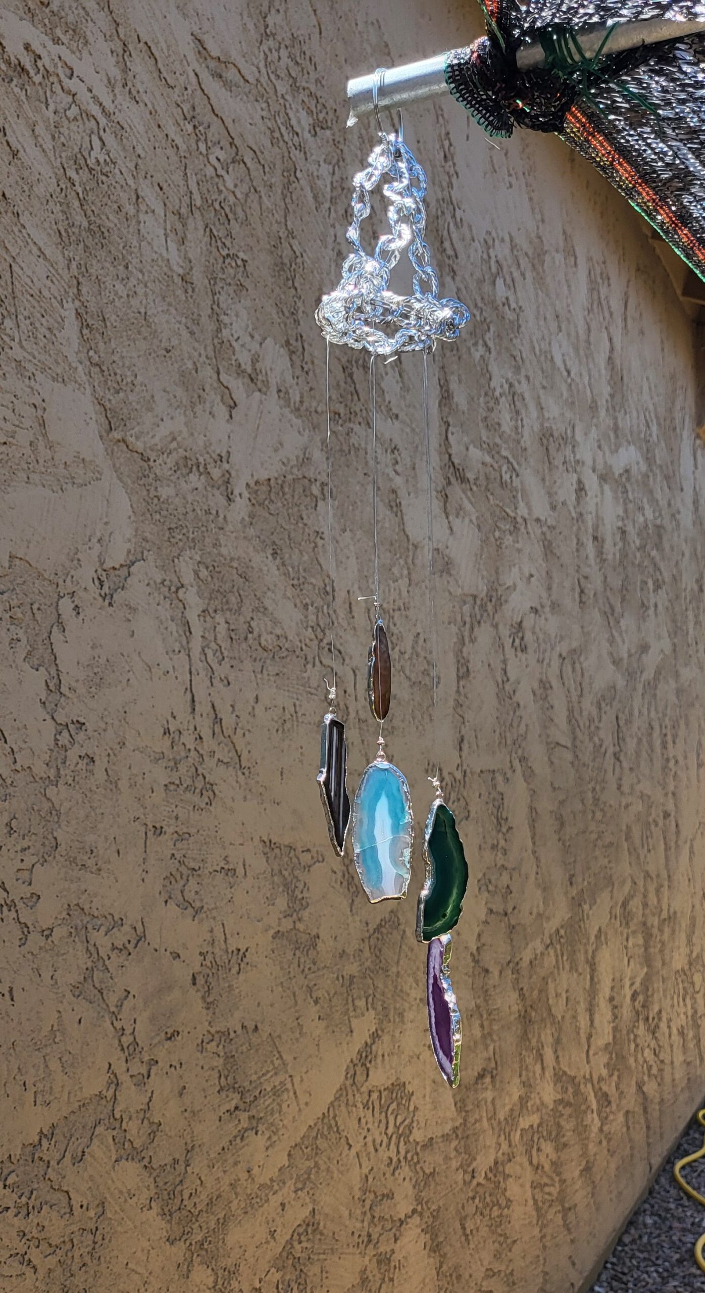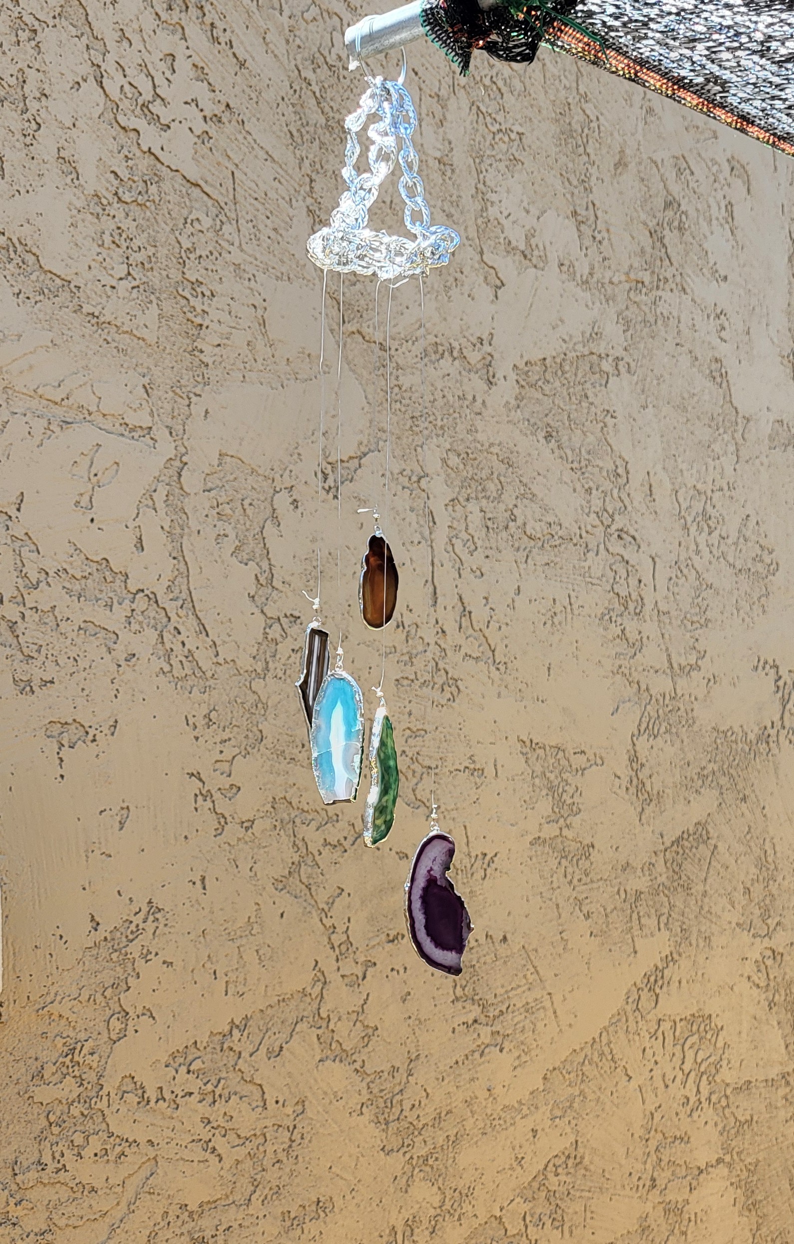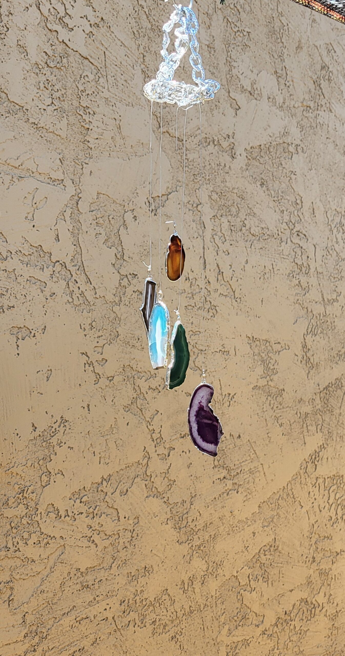 Windchime of silver crowned, agate slices; glimmering with intense colors of the chakras.